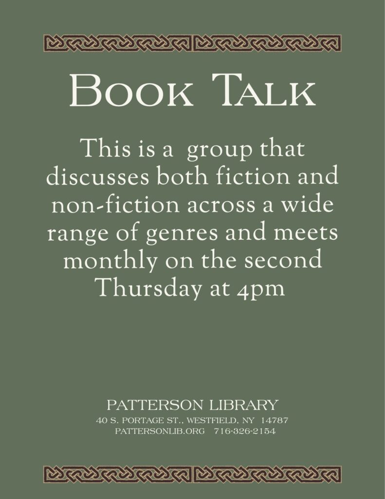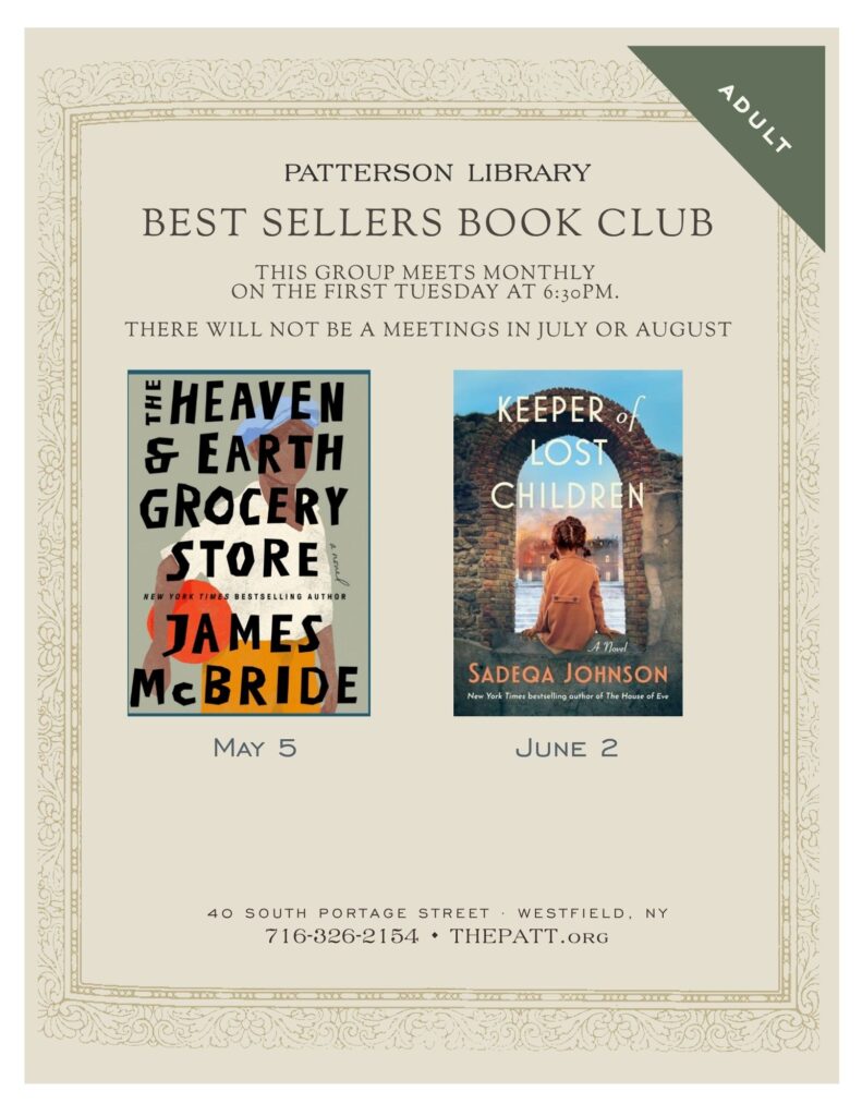 Best Sellers Book club read The Reading List by Sara Nisha Adams November 4, My Side of the River by Elizabeth Camarillo Gutierrez December 2, Wayward Girls by Susan Wiggs February 3, We Do Not Part by Han Kang in March 3, A Passionate Mind in Restless Pursuit -A Vision of Mary McLeod Bethune April 7 and The Heaven and Earth Grocery Story by James McBride May 5. This group takes summer meetings off.
