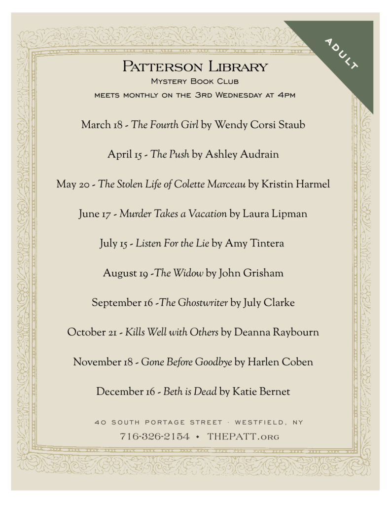 The Mystery Book Club will be reading The Fourth Girl by Wendy Corsi Staub March 18, The Push by Ashley Audrain on April 15, The Stolen Life of Colette Marceau by Kristin Harmel on May 20, Murder Takes a Vacation by Laura Lipman on June 17, Listen for the Lie by Amy Tintera and The Widow by John Grisham on August 19.