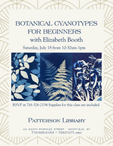 Calendar Add to Calendar Add to Timely Calendar Add to Google Add to Outlook Add to Apple Calendar Add to other calendar Export to XML When: July 18, 2026 @ 10:30 am – 1:00 pm 2026-07-18T10:30:00-04:00 2026-07-18T13:00:00-04:00 Where: Patterson Library 40 South Portage St. Westfield NY Contact: nancy nixon ensign 716-326-2154 Email Adult Program Art Class Classes Seniors workshop Elizabeth Booth-botanical Cyanotypes for Beginners