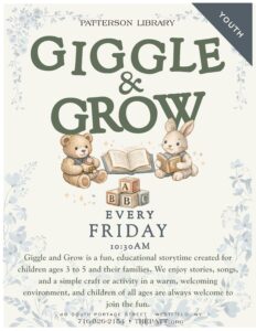 Giggle and Grow is a fun, educational storytime created for children ages 3 to 5 and their families. We enjoy stories, songs, and a simple craft or activity in a warm, welcoming environment, and children of all ages are always welcome to join the fun.