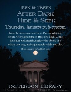 Teens & Tweens are invited to join us on Thursday, January 15, 6-7:30pm for After Dark Hide & Seek! Come have fun with friends, explore the library in a whole new way, and enjoy snacks while you play.